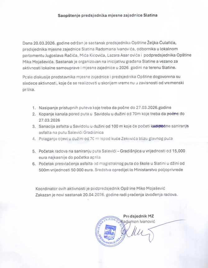 Na sastanku održanom 20. marta 2026. godine dogovorene su ključne aktivnosti za unapređenje lokalne infrastrukture u mjesnoj zajednici Slatina. Sastanku su prisustvovali predsjednik opštine, predstavnici mjesne zajednice, odbornici lokalnog parlamenta, kao i predstavnici opštinske uprave.