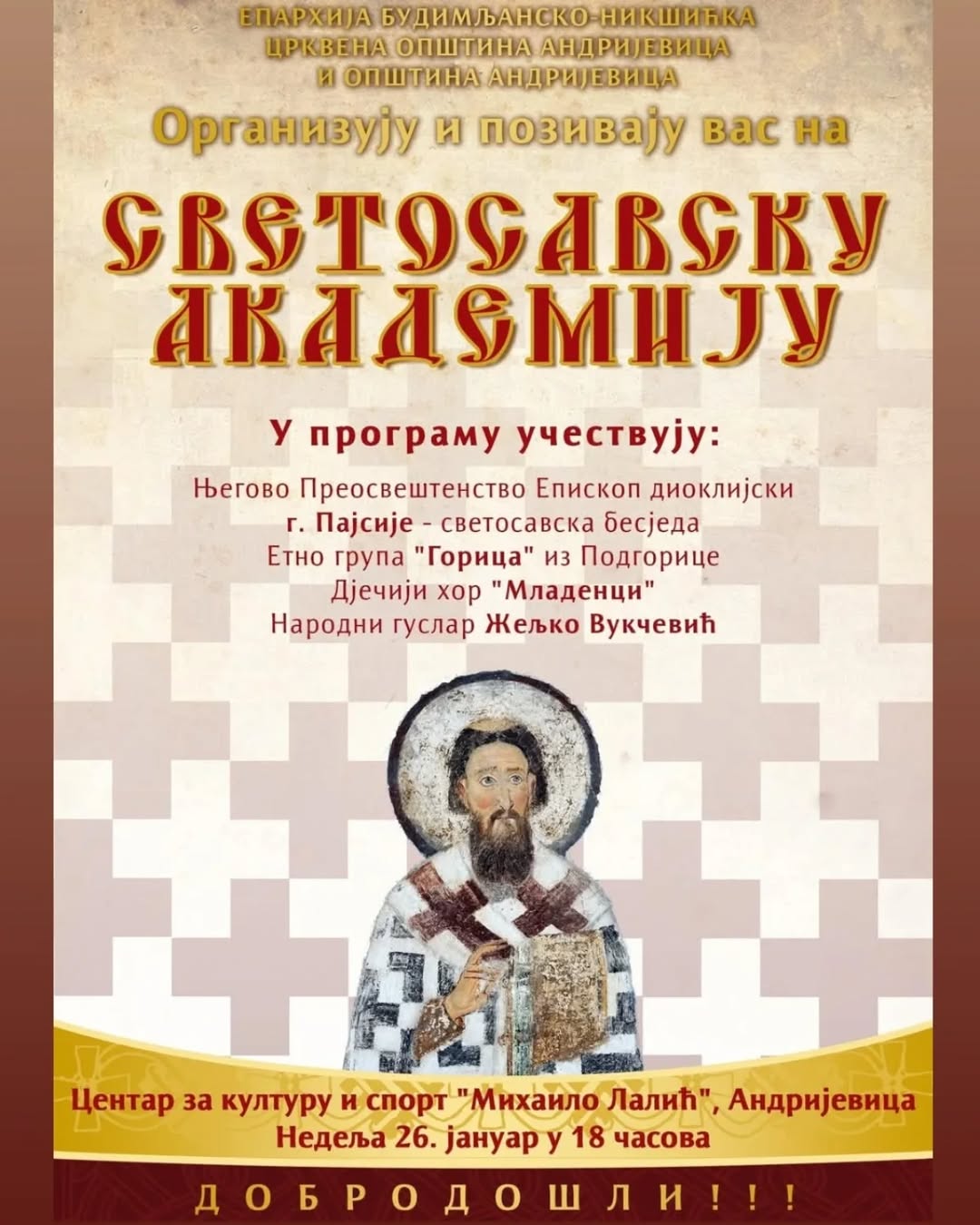 Eparhija budimljansko-nikšićka, Crkvena opština Andrijevica i Opština Andrijevica organizuju Svetosavsku akademiju u nedelju 26. januara, u Velikoj sali Centra za kulturu i sport "Mihailo Lalić", sa početkom u 18 časova.